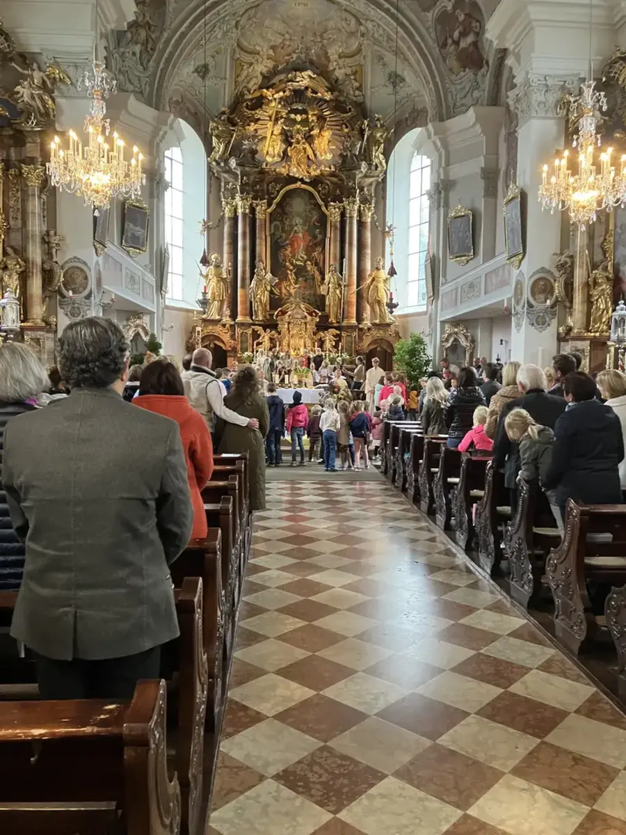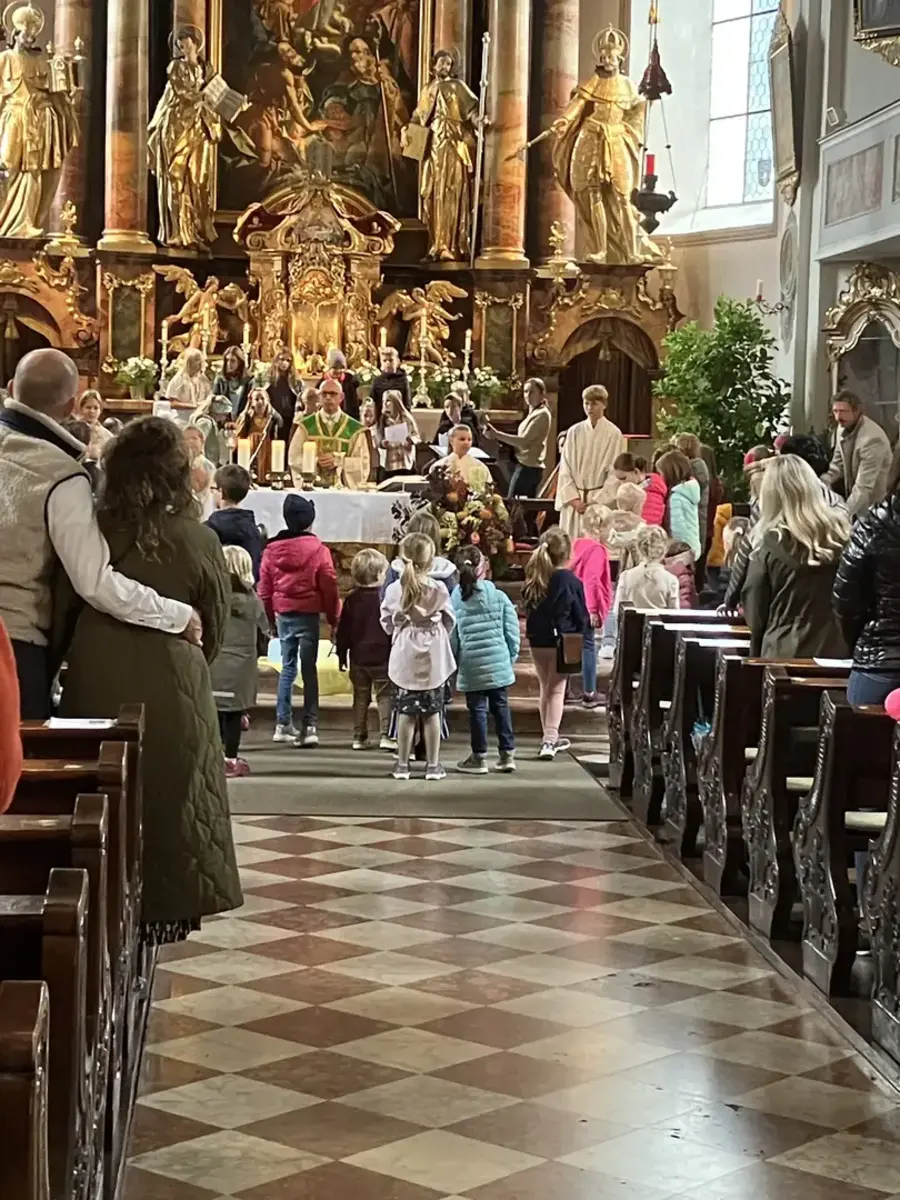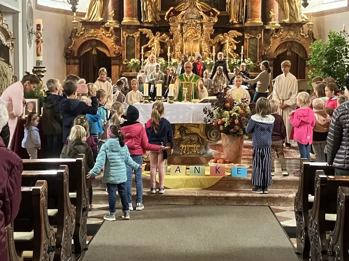 Am Sonntag, den 22.10.2023 konnte unser erster Familiengottesdienst in diesem Arbeitsjahr gefeiert werden. Viele Kinder kamen mit ihren Familien in die Kirche. Zu Beginn sangen wir das Lied „große kleine Leute haben sich versammelt, große kleine Leute feiern jetzt ein Fest“. Es war schön anzusehen wie groß und klein, jung und alt sich in der Kirche versammelten, um unter dem Motto „Wir danken und teilen“ zu singen und zu beten.