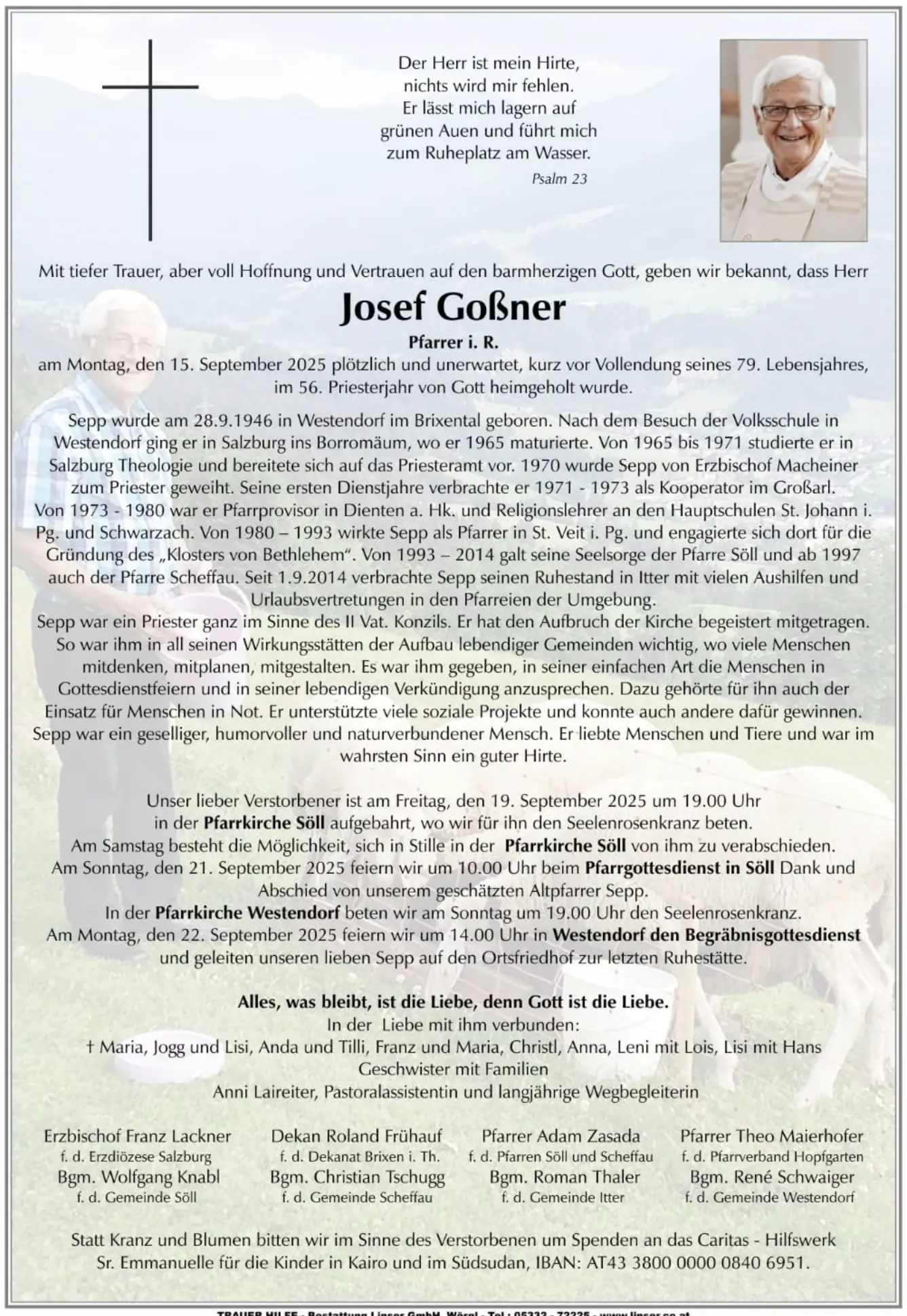 eine würdige Beerdigung in Westendorf unter Beisein vom Weihbischof und vielen Priester-Kollegen…….und zu guter Letzt am Sonntag ein Gruß von Sepp “von oben” während der Abschiedsfeier vor dem Pfarrheim am Sonntag, den 21.9.2025, mittags, ein Föhn-Tag ….man achte auf die Fahnen-Abordnungen vor dem Pfarrheim, unter Zeugen: das Bild ist KEINE Fotomontage …
