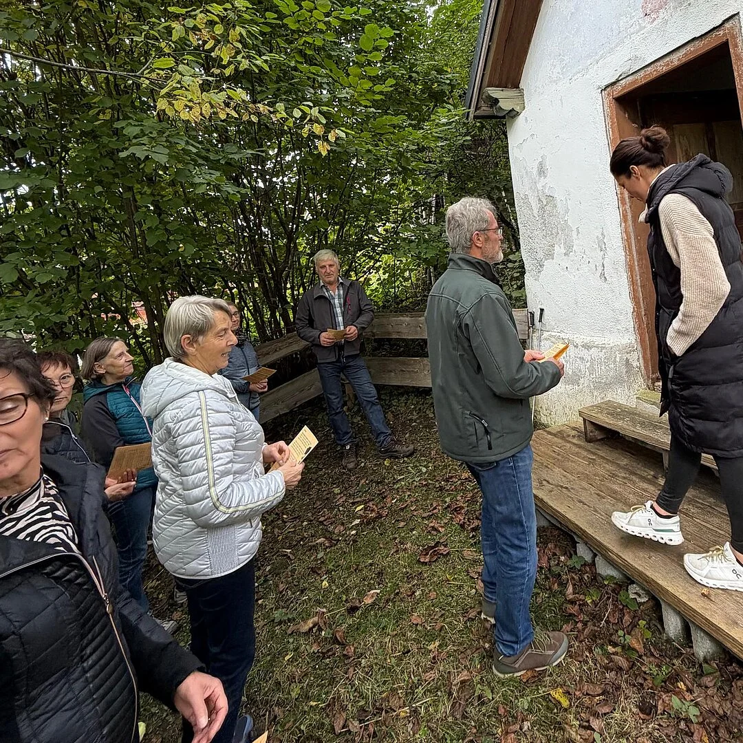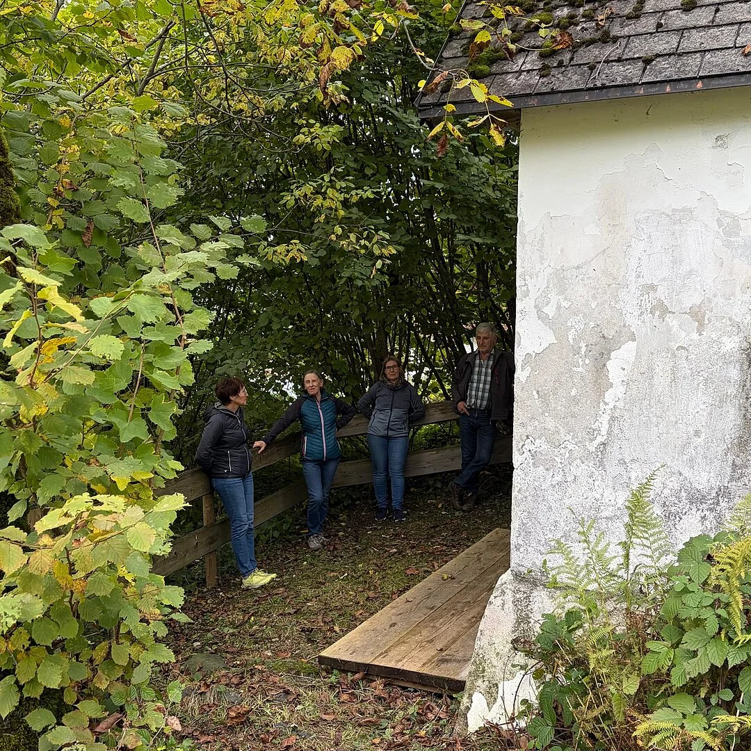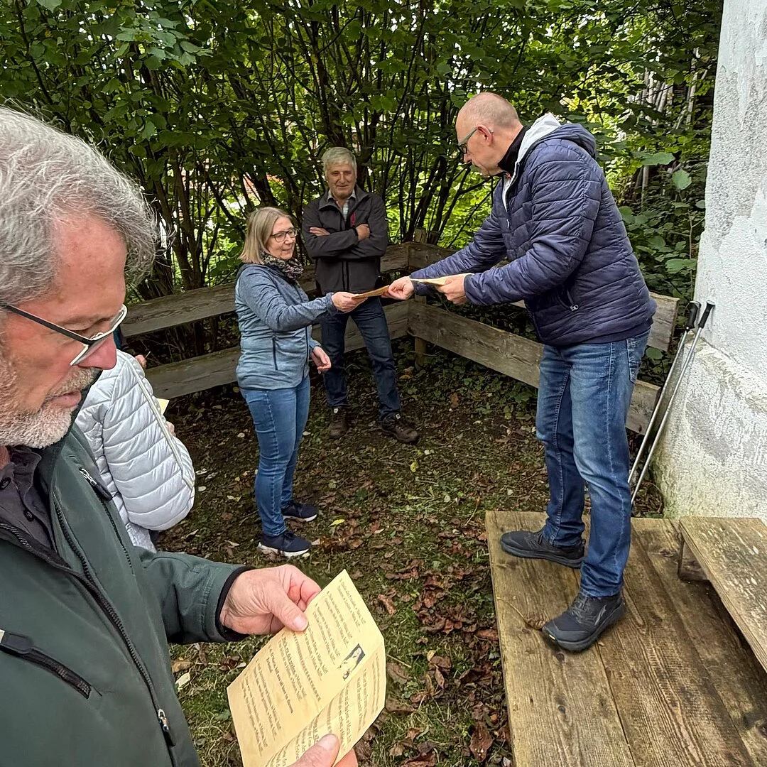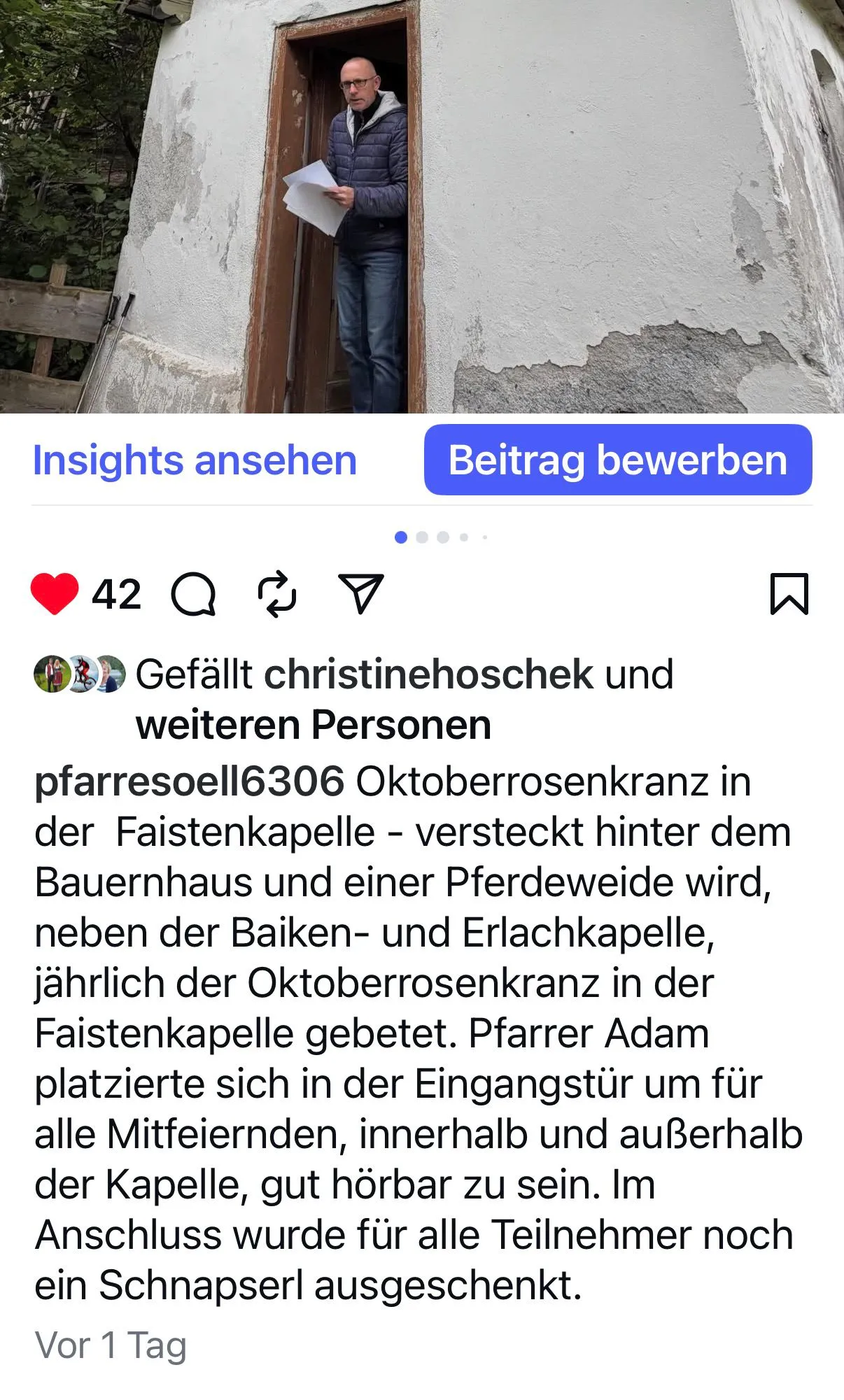 Oktober-Rosenkranz in der Faistenkapelle - versteckt hinter dem Bauernhaus und einer Pferdeweide wird jährlich - neben der Blaiken- und Erlachkapelle - der Oktober-Rosenkranz auch in der Faistenkapelle gebetetr. Pfarrer Adam platzierte sich in der Eingangstür, um für alle Mitfeiernden - innerhalb und außerhalb der Kapelle - gut hörbar zu sein. Im Anschluss wurde für alle Teilnehmer noch ein Schnapserl ausgeschenkt.