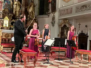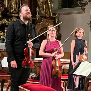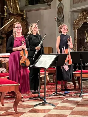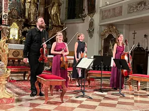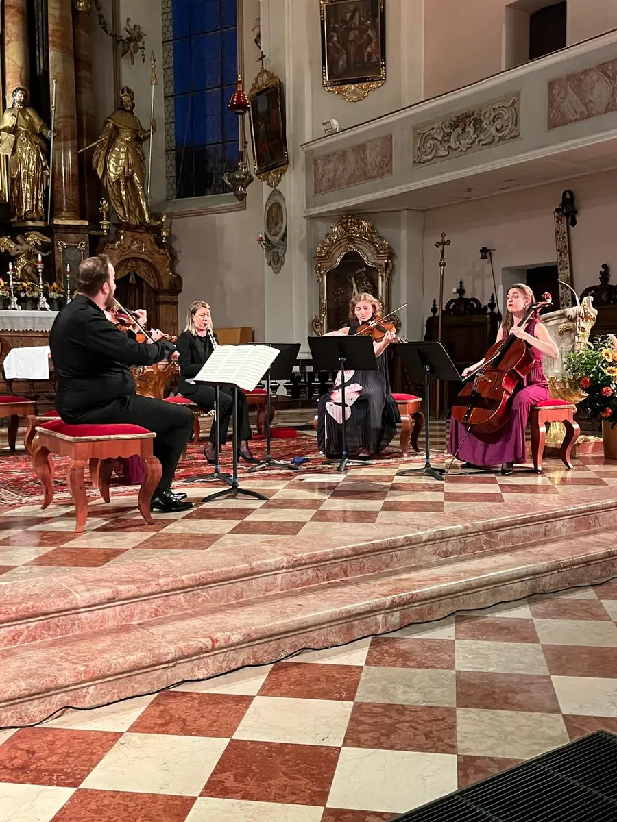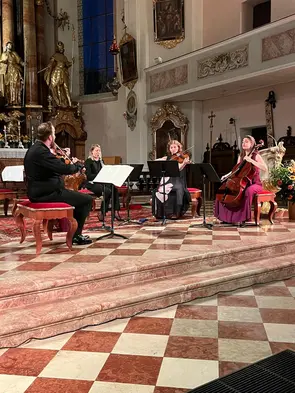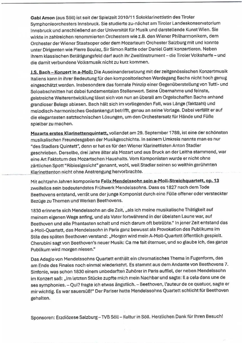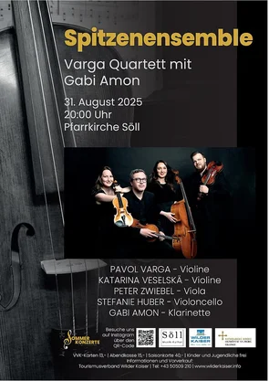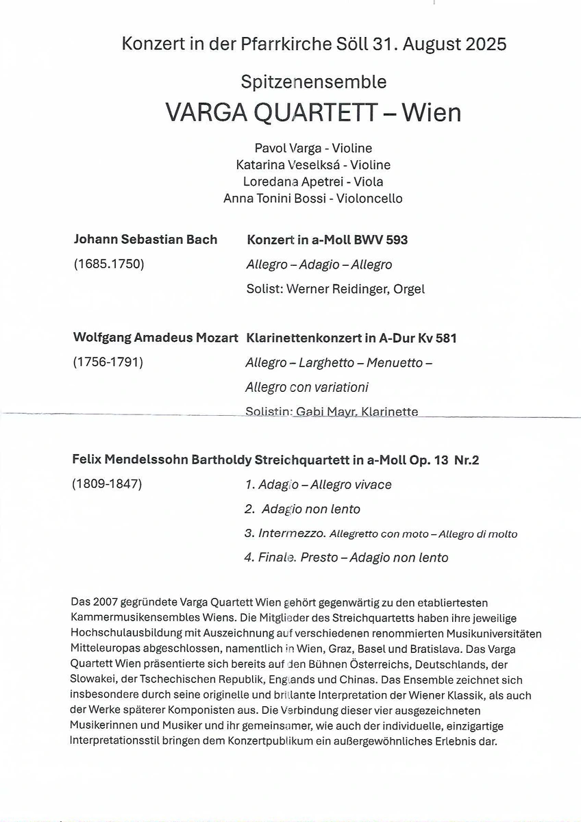Das Konzert des Varga-Quartetts in der Pfarrkirche Söll war ein Genuss von der ersten bis zur letzten Minute. Durch das Programm war für Abwechslung gesorgt: Das Konzert von Bach-Vivaldi in a-Moll war ein kraftvoller Einstieg mit der klangvollen Söller Pirchner-Orgel und Werner Reidinger an den Tasten. Nach einem Ortswechsel verschmolzen die Streichinstrumente im Klarinettenquintett von W.A.Mozart zu einem mitreißenden Klangkörper. Unglaublich, wie spannend es wird, wenn die Klarinette, lustvoll gespielt von Gabi Amon, den Streichern Motive und Harmonien zuwirft und sie den Ball zurückspielen. Nach dem übermütig/besinnlichen Mozart folgte ein frühes Konzert von Felix Mendelssohn Bartholdy. Dieser war mit 18 Jahren sehr betroffen vom Tod Ludwig van Beethovens und schrieb seine Erschütterung in diesem Konzert nieder. Das Varga Quartett brachte die Spannung und Schönheit dieser Literatur äußerst virtuos zu Gehör. Abgesehen davon war es Musik aus der Zeit der Erbauung der wunderschönen Söller Pfarrkirche, was dem Erlebnis die Krone aufsetzte.